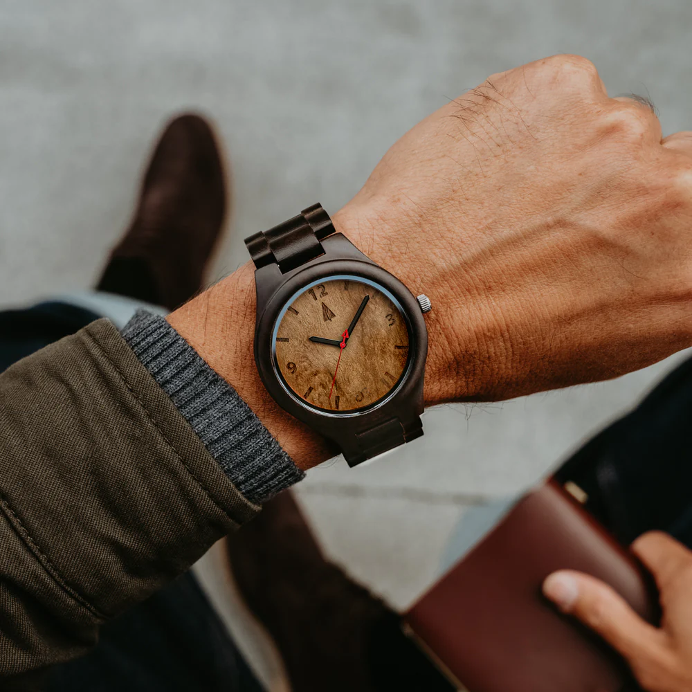 The Classic Ebony Maple Burl is a striking piece among our handmade wooden watches, combining rich ebony wood with a raw maple burl face. This luxury wooden watch features a 45mm case, high-quality Japanese quartz movement, and a stainless steel tri-fold clasp with push buttons. The strap and case are made entirely of wood, giving it the feel of a true luxury wooden watch. This is one of our most defining wooden watches – crafted for the casual adventurer who values simplicity and story.