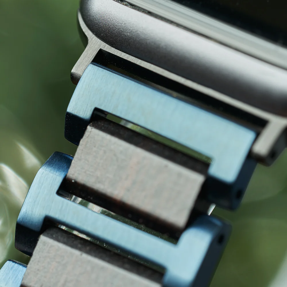 The Apple Strap Ebony is a standout in the world of men's Apple Watch bands, made from sustainable ebony wood and accented with blue stainless steel links. Designed for the man who values bold style and a deep connection to nature, it brings craftsmanship and intention to your tech wear.