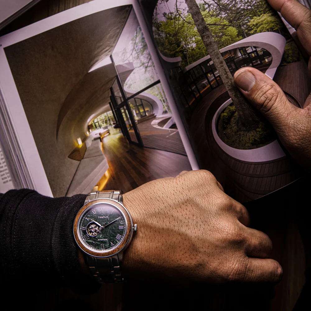Travel through time with the Atlas Collection – Treehut’s first automatic watch, built for the man who values craft and character. Each design pairs exposed mechanics with natural materials, bringing movement and intention to the surface. The real marble dial reveals the heartbeat of the watch, framed by a wood bezel and a vintage-inspired case. For a deeper, more earthy look, the collection includes a striking koa wood watch – combining rugged wood grain with refined mechanics. It’s not just about style. It’s about presence, patience, and progress – values that move with you, every day.