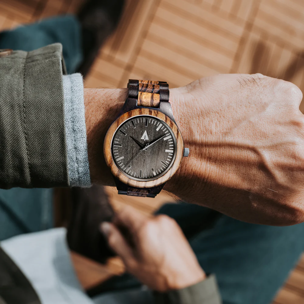 The very heart of the Treehut brand – and the beginning of it all. The Classic Collection was first imagined in Bali, inspired by the vibrant blend of modern design and raw, natural beauty. The harmony of duality comes to life in this ebony and zebrawood watch for men, using stunning natural wood to reflect the spirit of Treehut: grounded, balanced, and built for those who live with intention.
