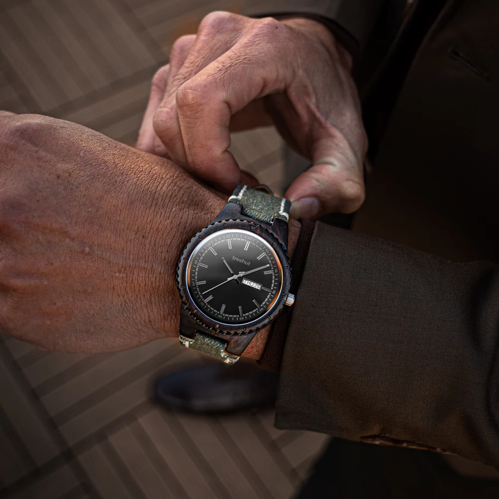 With a gear-shaped bezel, day-date function, and dimensional dial, it reflects the complexity of exploration. The ebony wood case keeps this wooden watch lightweight and grounded for daily wear. Paired with a military-grade canvas strap in denim blue and backed with Italian leather, this timepiece balances function and character.
