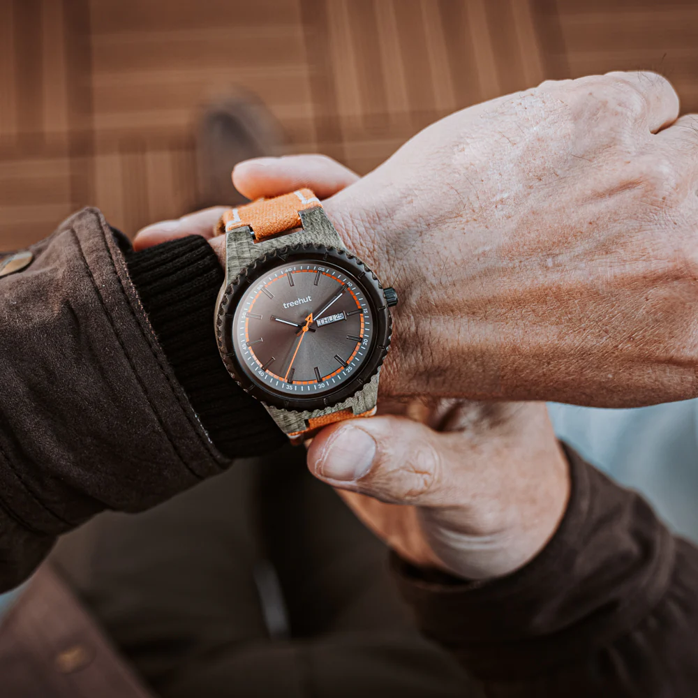 The dimensional dial includes slim hour markers, lume-coated hands for low-light visibility, and a functional day-date window. Crafted from grey maple and ebony wood, it’s a lightweight men’s wooden watch made for everyday wear. Finished with a bold orange military-grade canvas strap backed in Italian leather, this denim watch for men brings color, durability, and natural texture to your wrist.