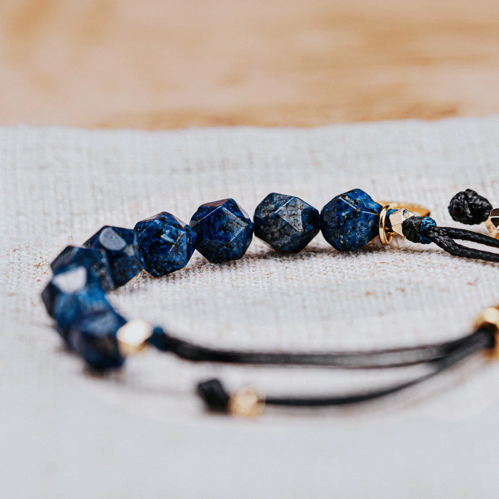 The Haven Navy Bracelet isn’t shy about color. Its deep blue, faceted stones pop against small gold accents and a black rope band that adjusts with a quick pull. It feels light on the wrist but adds plenty of presence, whether you wear it solo or layer it up.