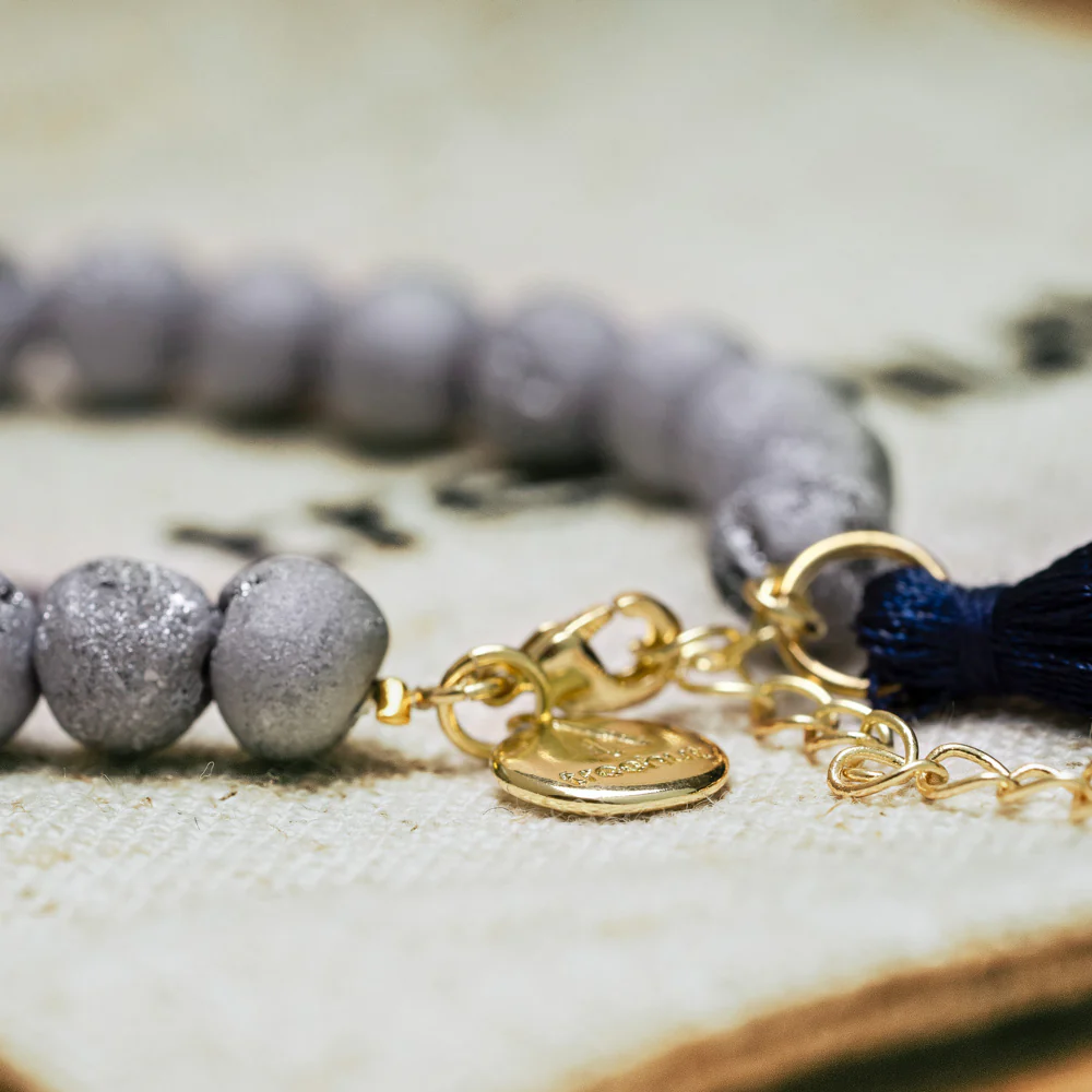 Simple, grounded, and a little unexpected, the Mala Grey Tassel Bracelet adds depth to any stack. This grey stone bracelet is made with matte-finished natural beads that bring a cool, minimal tone to your wrist. A deep blue tassel and gold accents offer a subtle contrast, giving the piece dimension and polish.