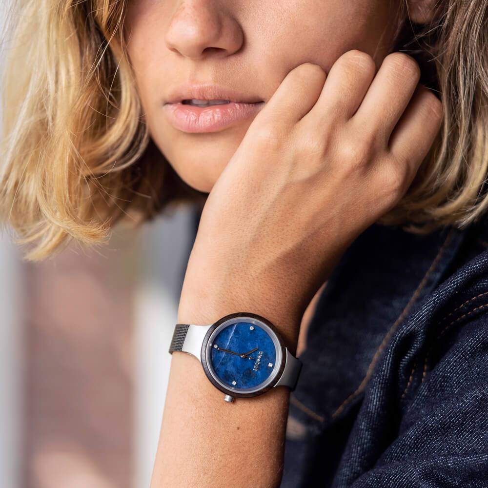 Its silver-toned stainless steel case is framed by an ebony wood-set bezel – an earthy edge to balance the polish. Paired with a gunmetal mesh strap, this piece feels like a statement marble watch for women that’s surprisingly wearable.