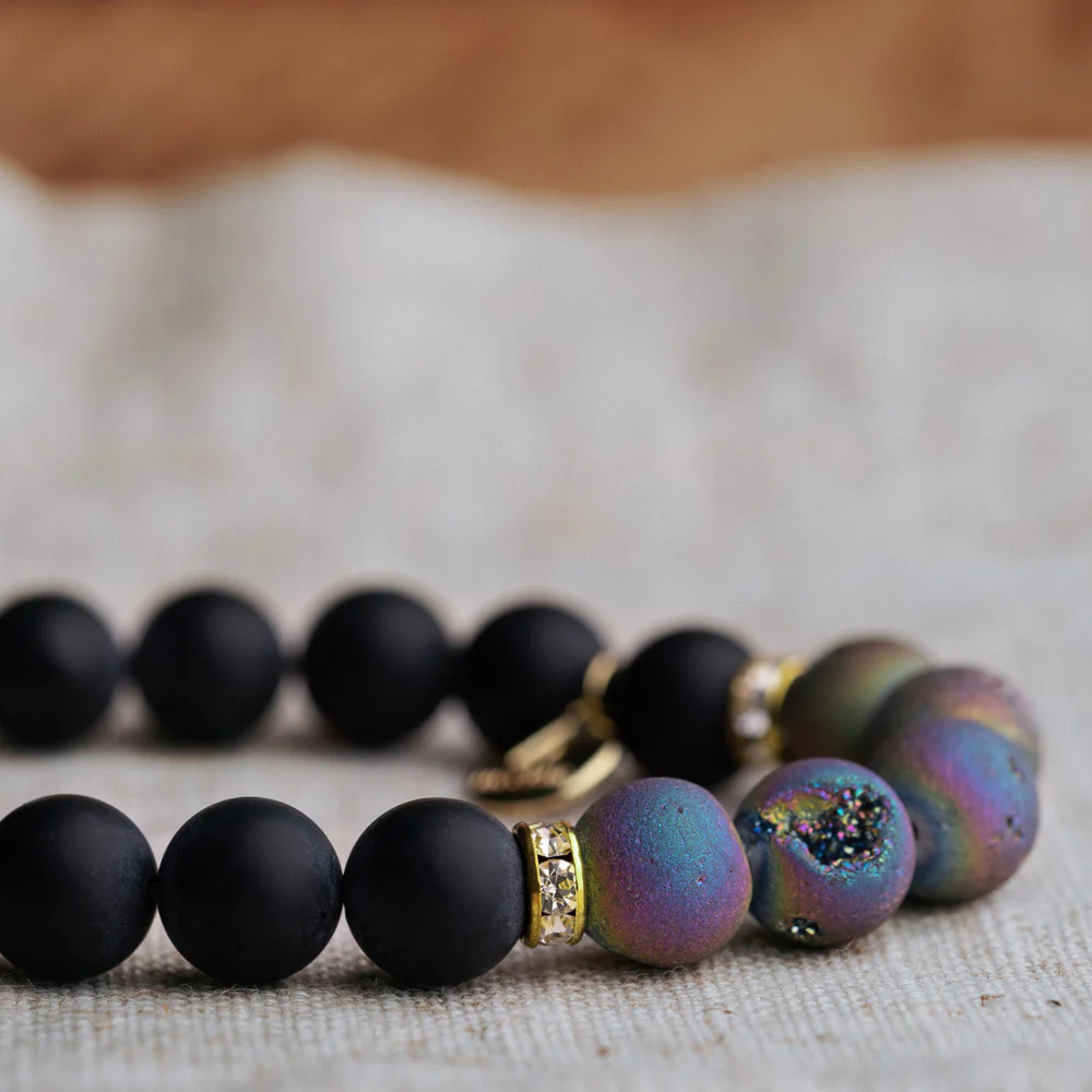 The Mourad Black Rainbow Bracelet pairs smooth matte beads with textured rainbow volcano stones, creating a bold yet balanced look. It reflects contrast in design – polished against raw, light against dark – giving it a presence that stands out in any setting.