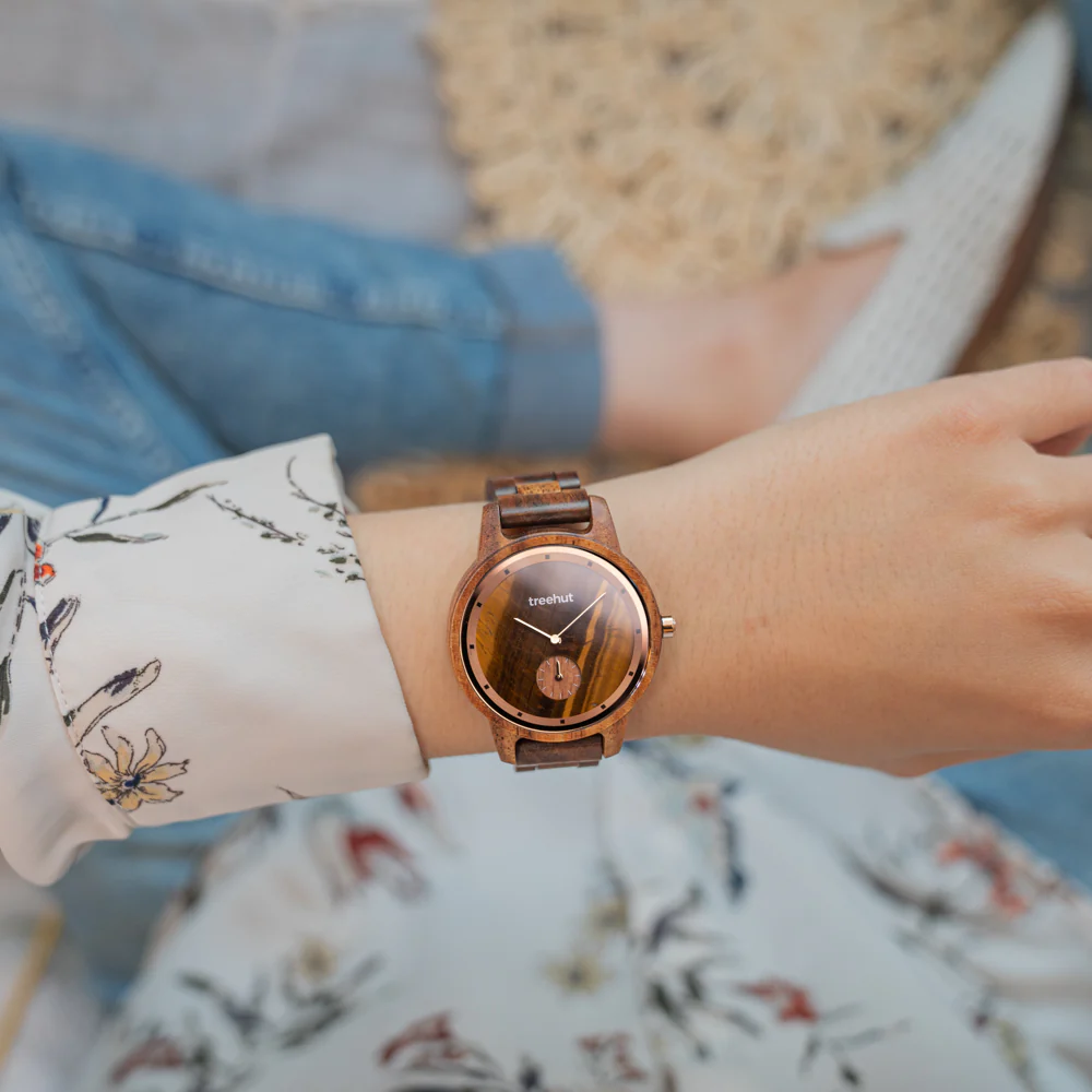 The Paradise Koa Tiger Eye brings depth and color to the world of women's wooden watches. With its genuine tiger eye marble dial and polished rose gold bezel, it captures the contrast of bold natural elements and refined craftsmanship. The koa wood case and strap offer warm tones that shift with the light, adding dimension with every movement.