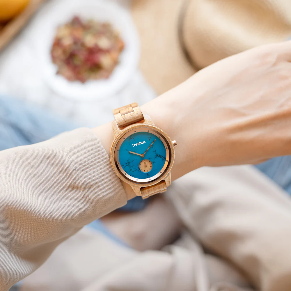 The watch keeps things light with its natural maple wood body, clean turquoise dial, and slim profile. It’s powered by a reliable Japanese Miyota movement and feels just as good as it looks.