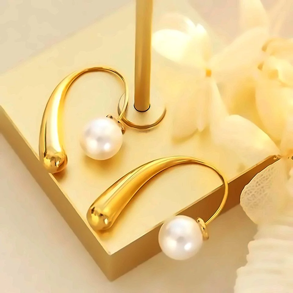 The Pearl Hanging Drop Earrings play with shape in a simple but striking way. Each gold earring curves gently forward, with a single pearl suspended from a fine wire loop beneath. The drop design gives the pearl just enough space to move, without distracting from the overall form. These are pearl drop earrings with a clear sense of direction and ease.