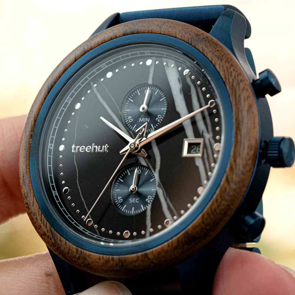 Powered by high-accuracy quartz chronograph movement, it tracks hours, minutes, sub-seconds, and date with precision. As a luxury wooden watch, the Rise Walnut Black Marble Blue is designed to balance utility with natural detail. It’s a black marble watch for men that feels refined, well-built, and ready for everyday wear.