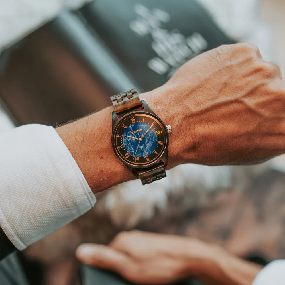 The Sojourn Blue Marble Ebony is crafted from rich black ebony wood and features a real blue marble dial, framed by a stainless steel ring and marked with Roman numerals. Its all-wood case and 5-link band strike a balance between structure and soul. Whether it’s a gift or a keepsake, this men blue marble watch is made to move with purpose. As part of our engraved wooden watches collection, it can be personalized to hold meaning far beyond its design.