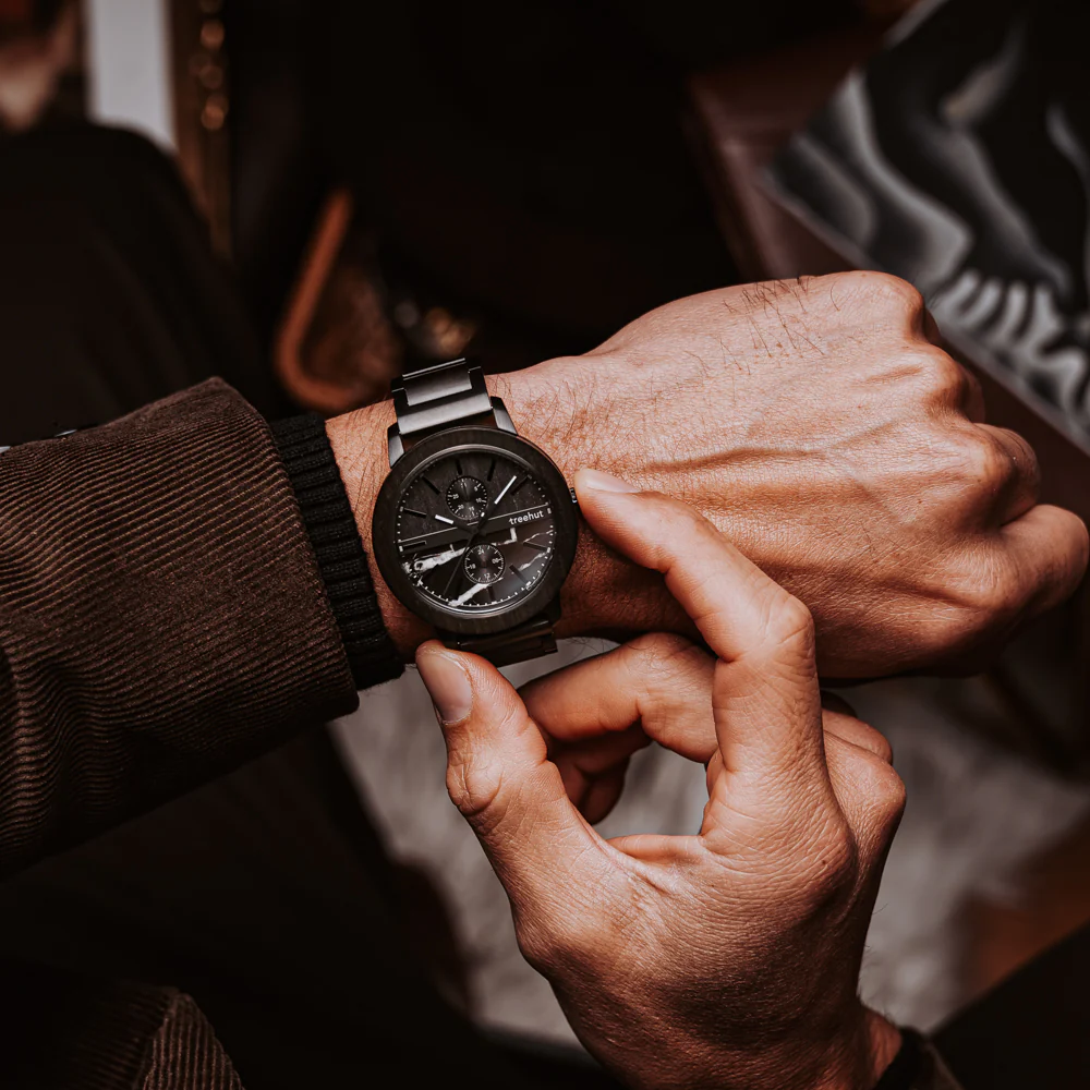 The Tao Marble Ebony Monochrome men's watch pairs real black marble with natural ebony wood in a striking dual-dial layout. It’s encased in a layered ebony wood bezel and black stainless steel case for a strong, monochromatic silhouette. Two vertically placed sub-dials display 24-hour military time and date. A central black bar, subtle mountain-inspired hands, and precise bar markings complete the refined, modern aesthetic. For those drawn to contrast and craftsmanship, it’s a defining marble watch for men. This piece also stands out as a signature Tao marble watch, balancing minimalism with statement design. With its material richness and thoughtful layout, it’s a powerful addition to the world of wooden watches for men.