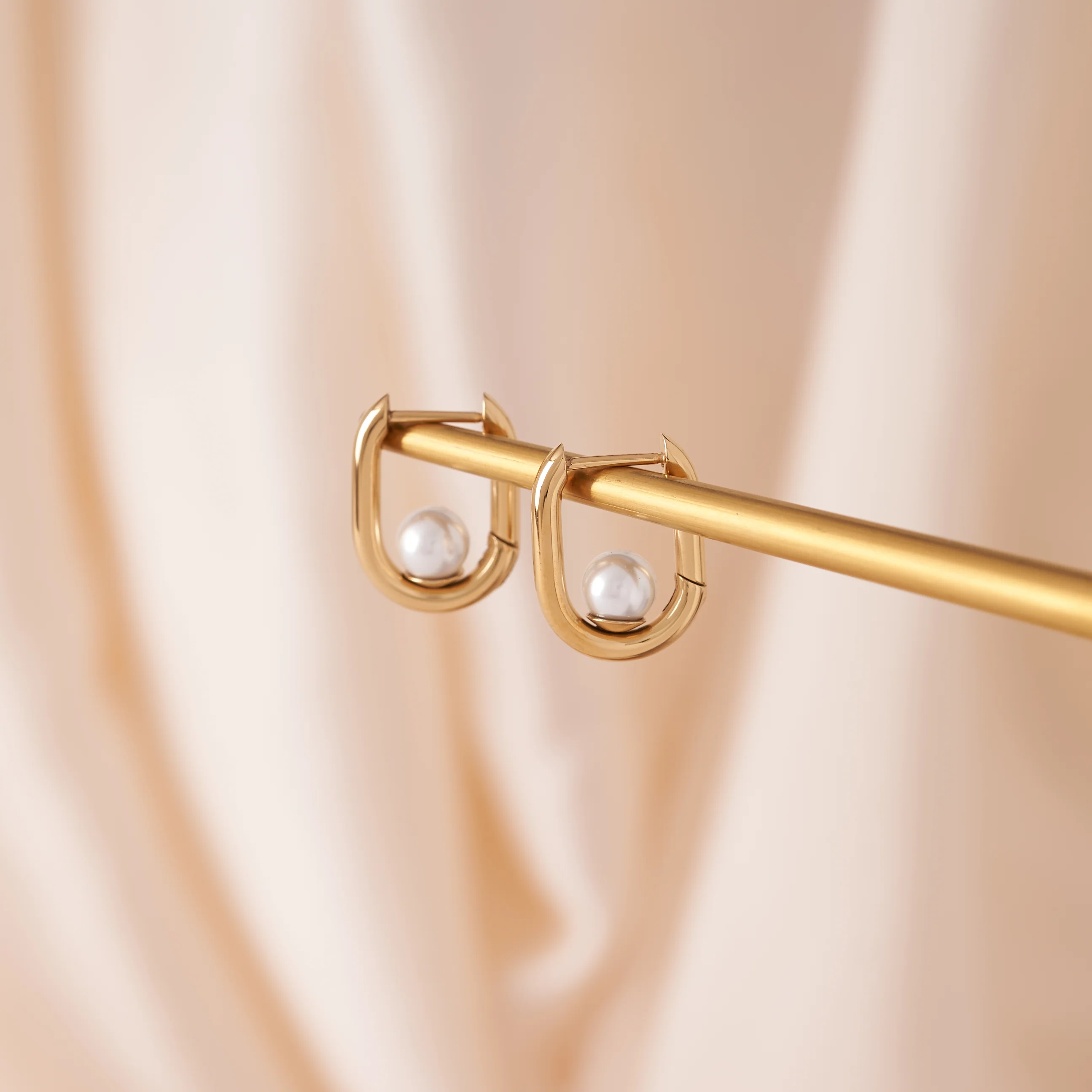 The U-Shaped Pearl Hoop Earrings break away from classic hoops with something more fluid. With squared gold curves and a single pearl resting low inside the frame, the design draws attention through shape rather than shine. These pearl drop earrings don't need movement or extra detail to make a point.