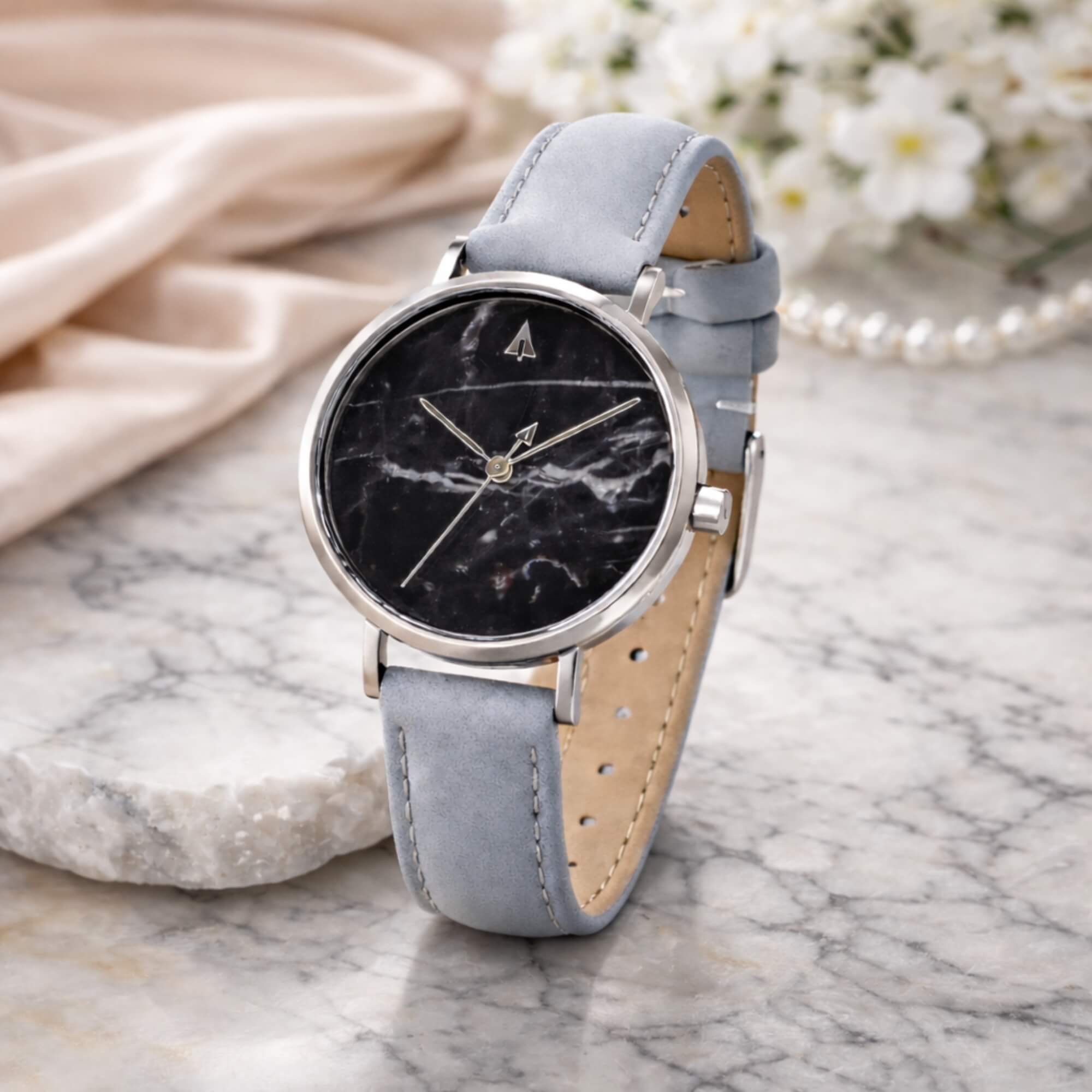 The Element Black Marble Grey is a black dial watch that keeps things simple and striking. The natural marble face gives each watch a slightly different pattern, so no two are exactly alike. Its clean black dial sits inside a polished silver stainless steel case, matched with a soft grey vegan leather band that feels good on the wrist and good to wear.